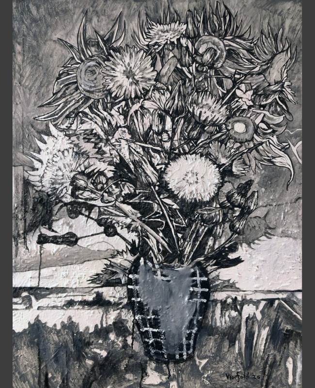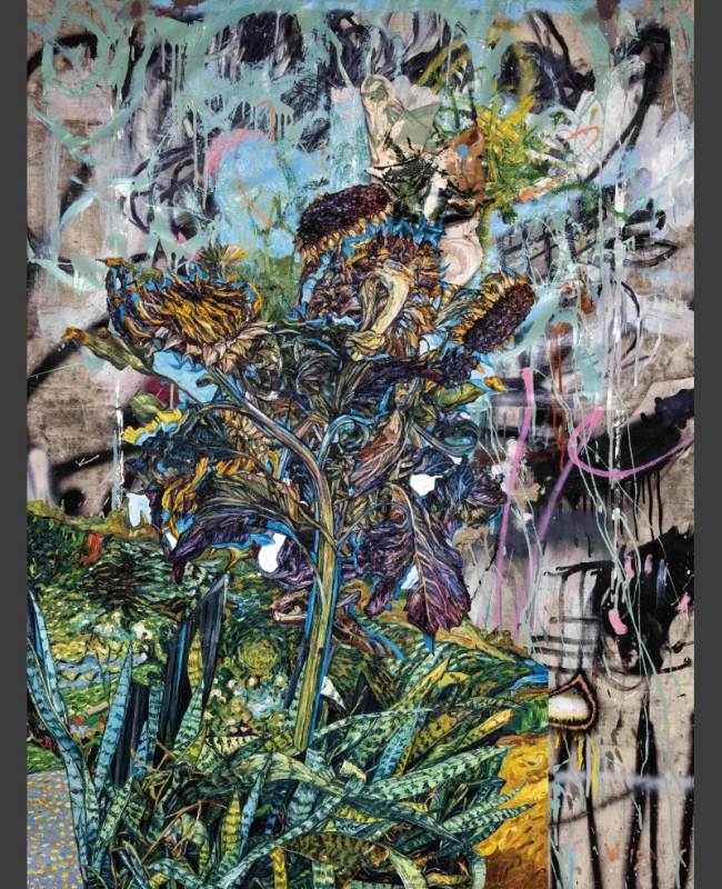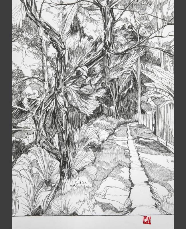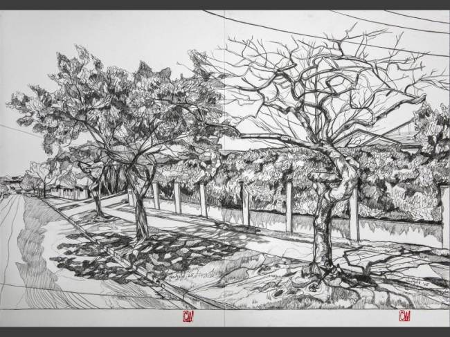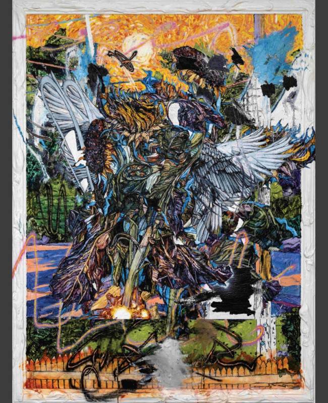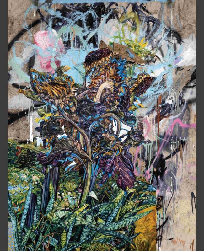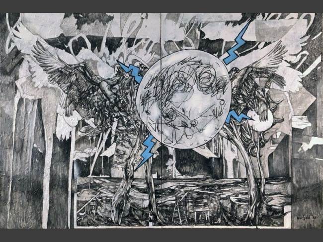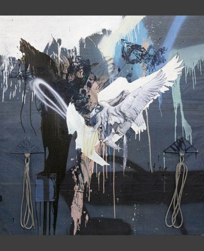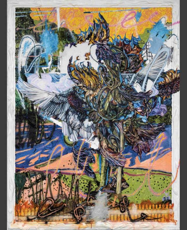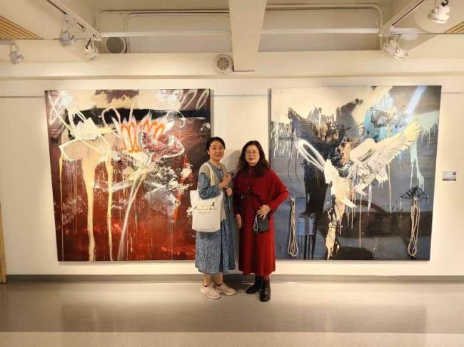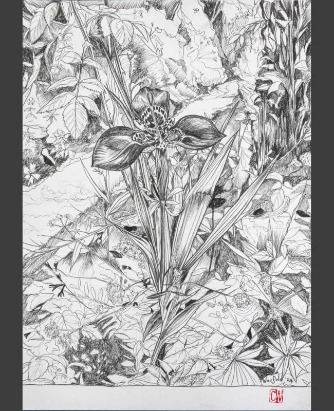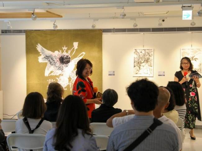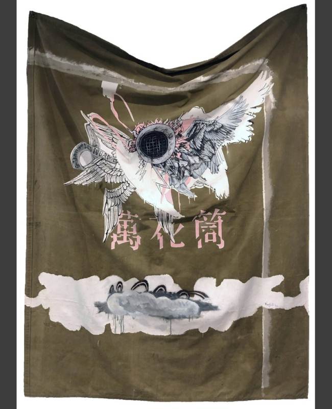 The exhibition is titled Kaleidoscope metaphorically because of the idea that eastern and western cultures can mix together andreflect one another to create wonderful new and harmonious patterns. Also, much like a kaleidoscope, Chris’s work often repeats and reuses images in iterative ways. Here flowers, wings and landscapes are combined and recombined in new paintings, drawings, and prints. The flowers are symbols of growth, the wings represent freedom and transcendence, and the landscapes map physical and mental space. You can see that some of the works completed this year contain the same motifs as works that were completed a decade ago, like a kaleidoscopic dream they present us with surreal variations of forms.